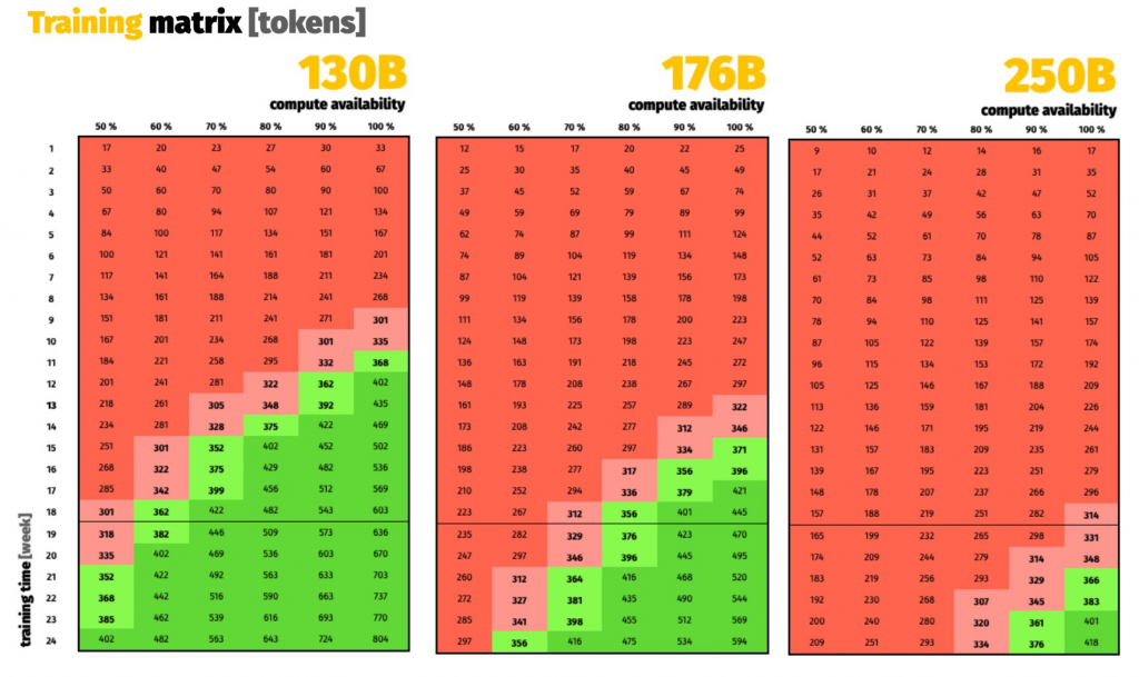 Zuerst haben wir Skalierungsgesetze abgeleitet, die uns eine obere Grenze für das „optimale“ Modell mit unseren Rechenressourcen geben: das wären etwa 392 Milliarden Parameter, die für etwa 165 Milliarden Tokens trainiert werden (mehr zu diesem Budget später). Aber Skalierungsgesetze berücksichtigen keine Kosten für das Servieren/Inferieren, die Leistung bei nachgelagerten Aufgaben usw. Außerdem müssen wir sicherstellen, dass ressourcenarme Sprachen während des Vortrainings genug Tokens sehen. Wir wollen nicht, dass unser Modell ganze Sprachen ohne vorheriges Training bewältigen muss, oder? Daher haben wir beschlossen, dass wir mindestens für 300-400 Milliarden Tokens vortrainieren sollten.